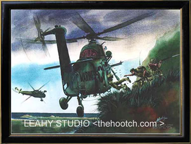 Emergency Extraction. "A VMO UH-1E rescues several wounded Marines while under fire from a low ridge near the Rockpile in Vietnam. Not only signed and numbered by the artist, but also signed by the Huey helicopter pilot pictured, former Captain Alan H. Barbour USMC. Edition of 525 prints, with 50 artist's proofs."