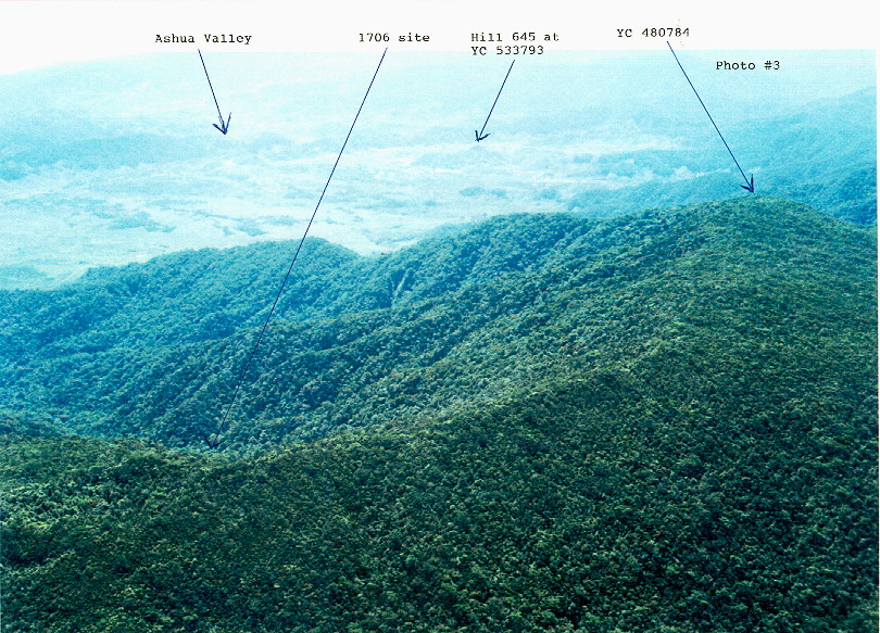 A copy of a color photo showing the area of the Laos-VN border where the Huey was shot down.