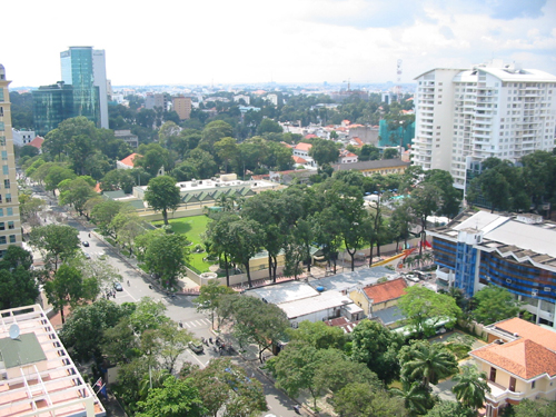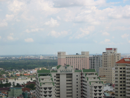 The Legend Hotel (pink building) in Saigon, on the Saigon River.