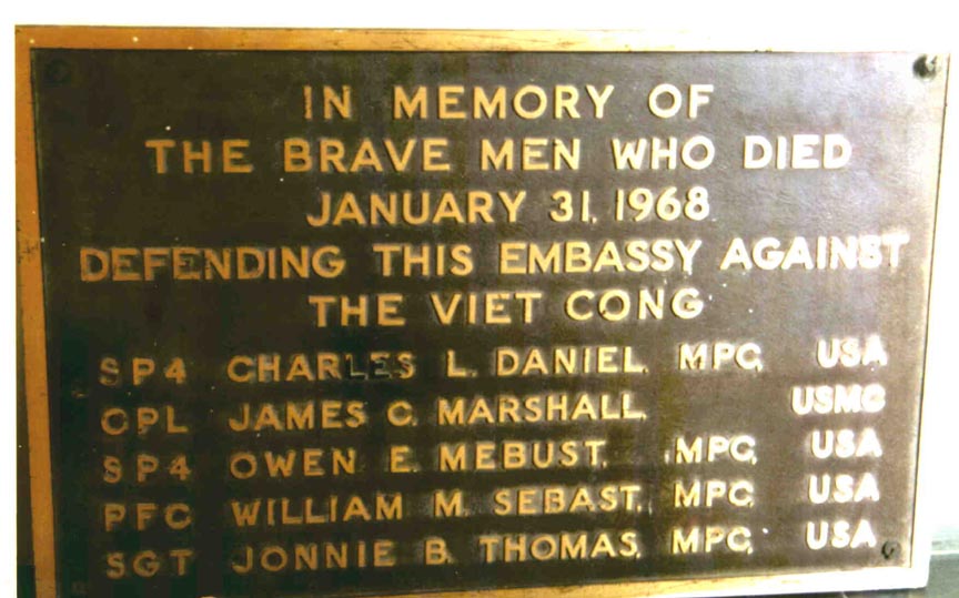 memorial plate which was dedicated to the men killed defending the US Embassy during TET 68. It was in a small [Vietnamese] museum...stuck away behind some other display cases [and] out of view until I caught sight of it.