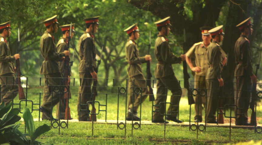 Training for Guard Duty must be a universal experience ..... same drill, different uniforms. Here, Vietnamese soldiers practice under the watchful eye of a senior officer behind Ho Chi Minh's Tomb.