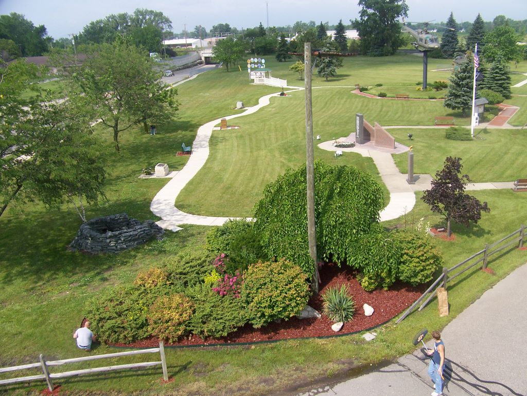 This overhead view taken near the entrance shows the current configuration with all the new memorials, monuments and static displays along the "Path of Honor" sidewalk which was added in 2005. In the background, you can see the nose of the Vietnam era Cobra helicopter just below and right of the steel post mounted Huey.