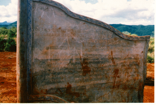 The guide motioned for us to go back to the van. I noticed an old boot, a fan belt, and part of a gas grenade as we walked. The guide asked if we wanted to take a picture of the monument. Near the highest elevation point was a shabby masonry monument that I had never heard of, and well adorned with Vietnamese graffiti. We took pictures and asked the guide to translate the Vietnamese inscription: