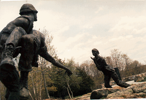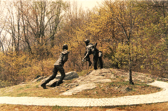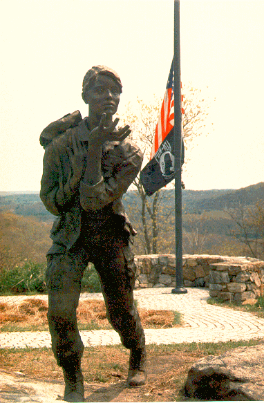 Some say the site is reminicient of the Central Highlands. Near the nurse is a small polished stone with the names of the eight nurses who lost their lives in the war. The oeblisk, black Italian marble (same as the WALL), has 215 names of Westchester residents that lost their lives. To get to the site you must walk from the clearing on the narrow path thru the woods up an easy hill. As you walk you may reflect that each of your two steps is about the length of one person, about six feet, one coffin length - 215 coffins lined up to the Memorial. Once you get to the Memorial you come to 5,800 cobble stones, hand cut from New Hampshire granite, that lead you around the obelisk, the flag MIA and Stars & Strips, the statues, each stone the count of ten dead. Yet, with the emphasis on the dead and the sacrifice they gave, this site is a beautiful, peaceful, and life fulfilling. The view is spectacular, the woods the spectrum of life, the wildlife mostly hidden but sometimes noisy.