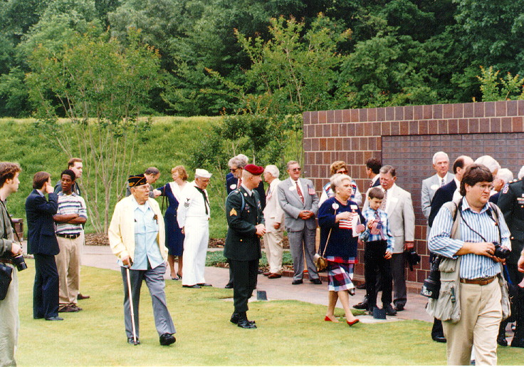 Here are four recent pictures of the Memorial submitted by Doug Maston. They were taken at a wreath laying ceremony on Memorial Day, 1996. The Secretary of the Army, Togo West was scheduled to lay the wreath, but his plane was fogged in at National Airport in D.C. Instead, the Commanding General of Fort Bragg, NC (Lt Gen John M. Keane) laid the wreath. These photos are .jpg files.