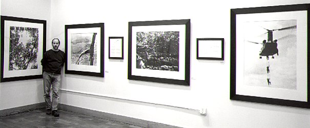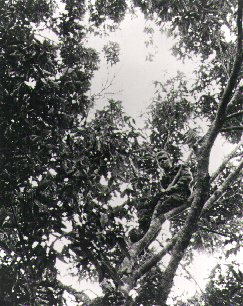 "Martin was in the trees trying to spot enemy in the valley below. The jungle was too thick to see, so a trip in the trees afforded a better view. He seems so alone and almost part of the tree. His eyes are so dark and hollow that he looks like a monkey or a skull. It is as though he is death looking at us."