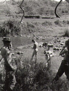 "A mountain stream below the darkness of the jungle canopy. One of the few occasions to wash."