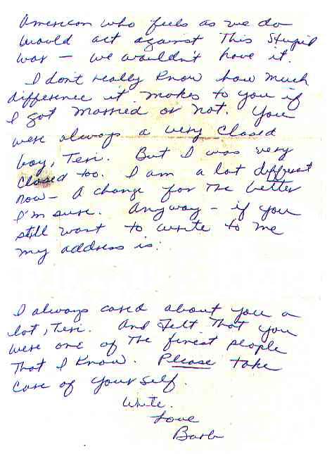 I was disappointed and very angry. I had no opportunity to be with any of the "people," and I was excited to be able to talk with this young girl who spoke English. This exchange was perhaps the most pleasant event since I had arrived in Vietnam, and this M.P. was stopping me. I asked him why he was doing this, and he said that sometimes the children carried hand grenades because they could get close to the G.I.s. I was extremely disappointed.