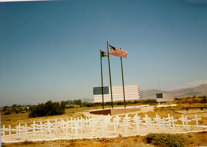 A picture showing the "cemetary" with the crosses and the U.S. and POW flags the flags are somewhat tattered and need to be replaced