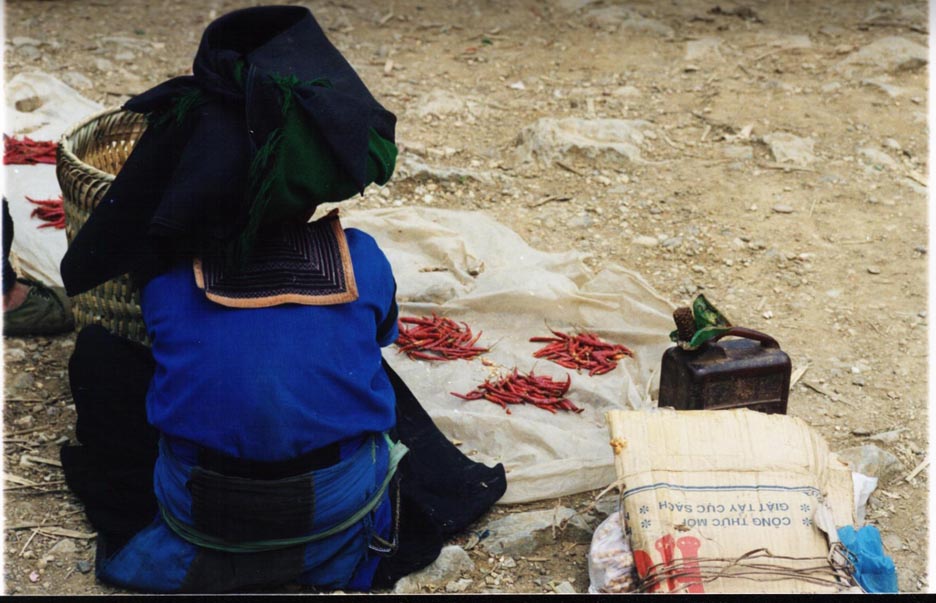 This White H'Mong woman walked about 10 km from her village to sell chillies at the market. In traditional colorful hill tribe dress, the White H'Mong come to the market to show off their clothes, meet with friends, and drink heavily.