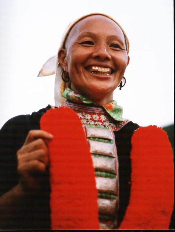 This is a Red Dzao lady. Because she is from a rich and powerful family, she has a right to wear the big hat. The Red Dzal Tribe lives in the mountain regions in northern Vietnam. In each area, they dress a bit differently, but all use red color to decorate their clothing (and thus the Tribal name Red Dzao). Also, the Red Dzao have a habit of shaving their hair and eyebrows. For them, that is beauty.