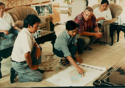 Vietnamese and Americans examining plans for the Peace Park in Ha Bac Province, Vietnam. On the left is Nguyen Ngoc Hung, a North Vietnamese veteran who, in 1990, was so moved during his visit to the Vietnam Veterans Memorial Park near Neillsville, Wisconsin, that he lit an incense stick and said a prayer for his brother who had been missing in action for over 20 years.
